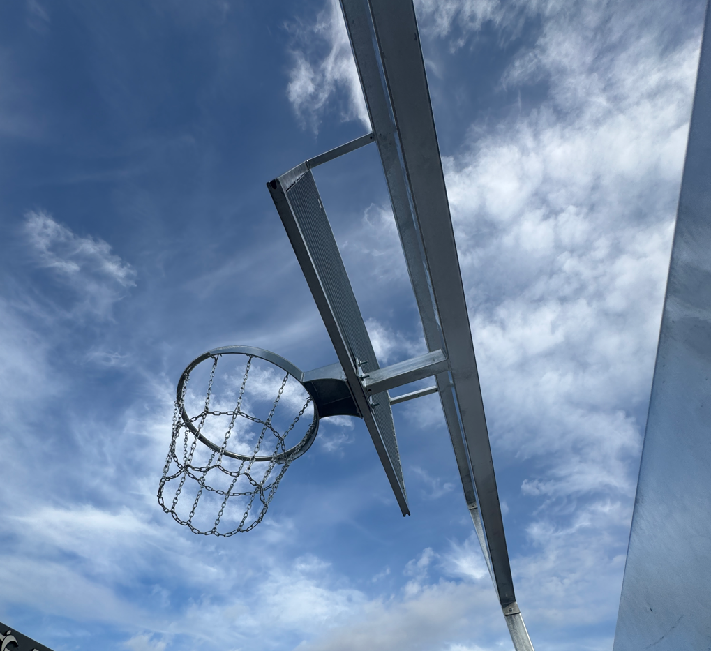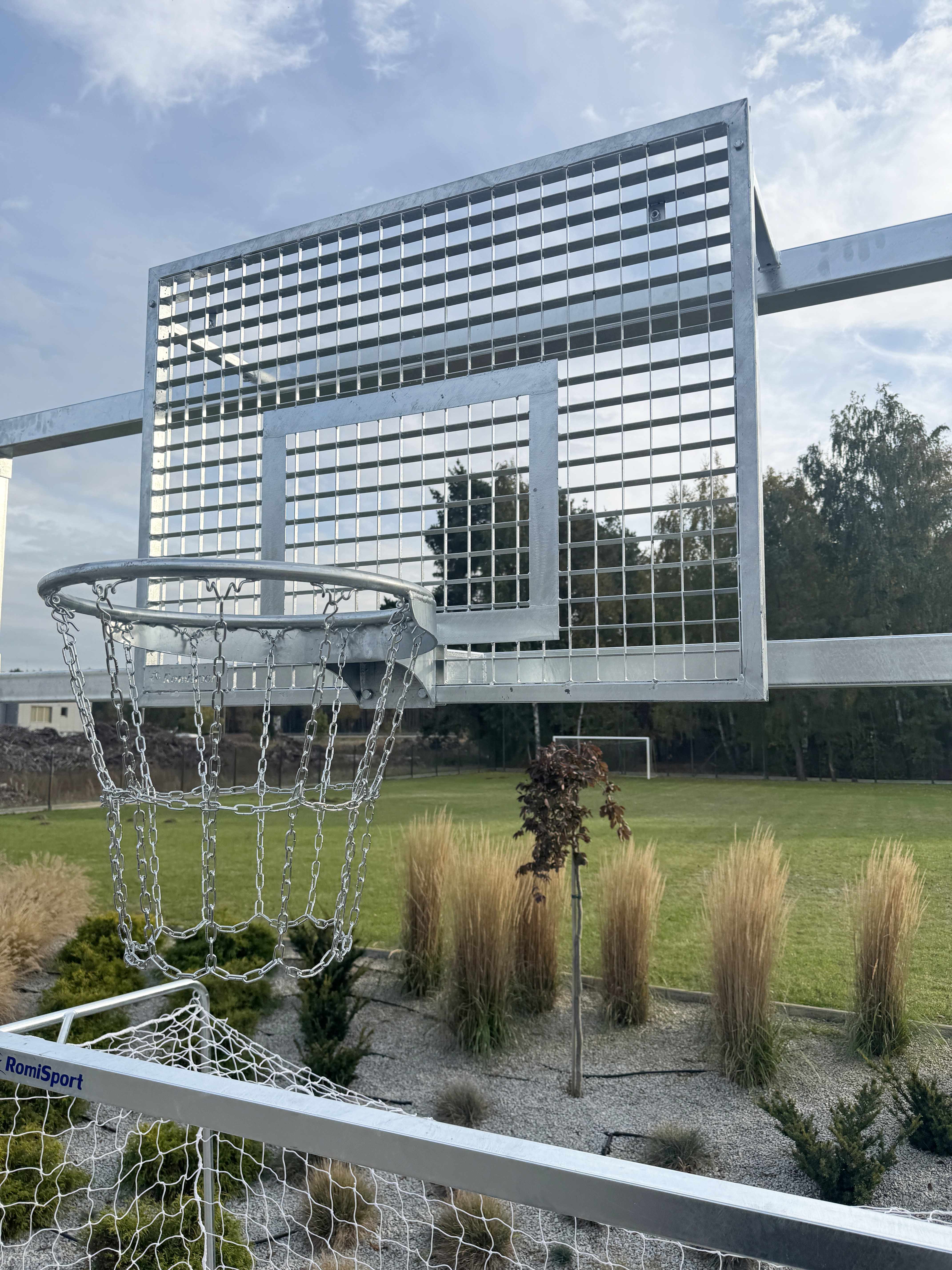 Tablica kratownicowa o wymiarze 120 × 90 cm z ocynkowaną obręczą oraz siatką łańcuchową zwiększa odporność na warunki atmosferyczne i uszkodzenia mechaniczne. Konstrukcja mocowana jest do podłoża w tulejach lub do zabetonowania na głębokość 80 cm, co zapewnia maksymalną stabilność i eliminuje ryzyko przewrócenia lub przesunięcia bramko-kosza podczas intensywnej gry.