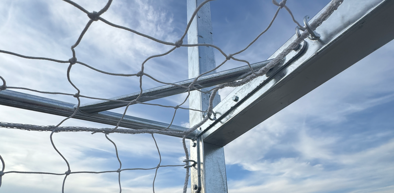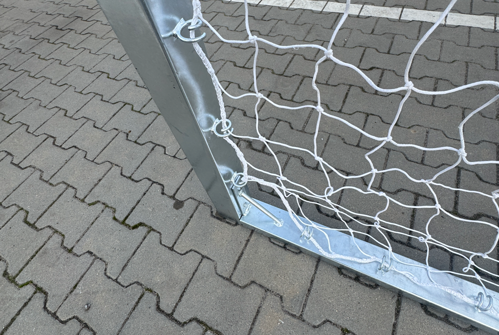 Rama główna wykonana jest ze stali, z kwadratowego profilu 80 × 80 mm z wewnętrznym użebrowaniem, natomiast dolna rama zastosowano profil 80 × 40 mm. Tylny i boczny szkielet z pałąków fi 34 mm stabilizuje całość konstrukcji, utrzymując prawidłową geometrię i zapewniając odporność na odkształcenia oraz uderzenia piłki. Stalowa rama gwarantuje trwałość i bezpieczeństwo nawet przy długotrwałym użytkowaniu.