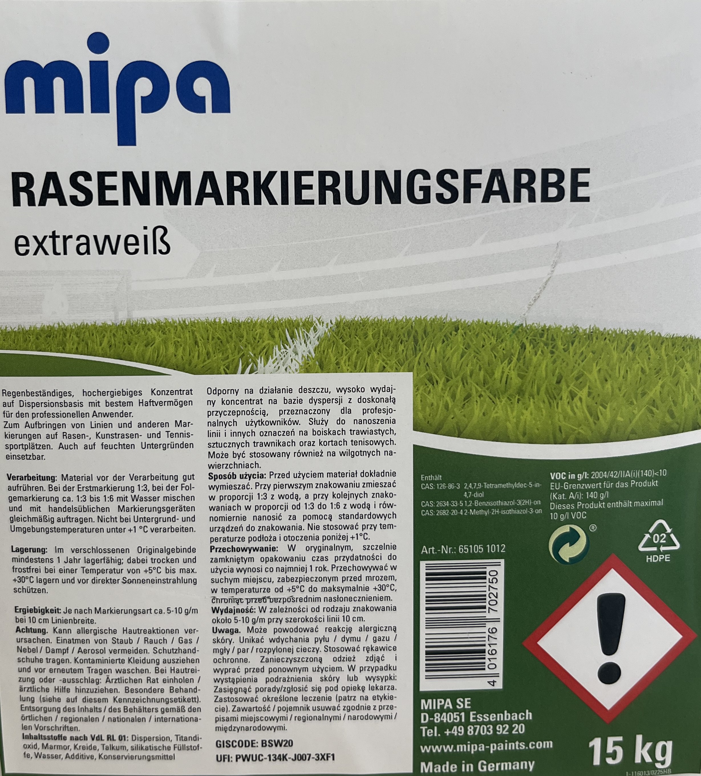 Wysokiej jakości farba do malowania linii na boisku marki MIPA (dawniej Haering) przeznaczona do oznaczania boisk pokrytych murawą, sztuczną trawą i powierzchni twardych.