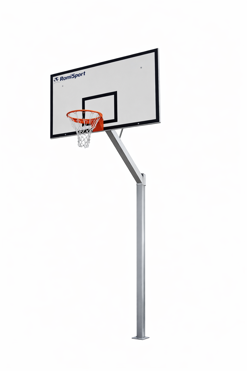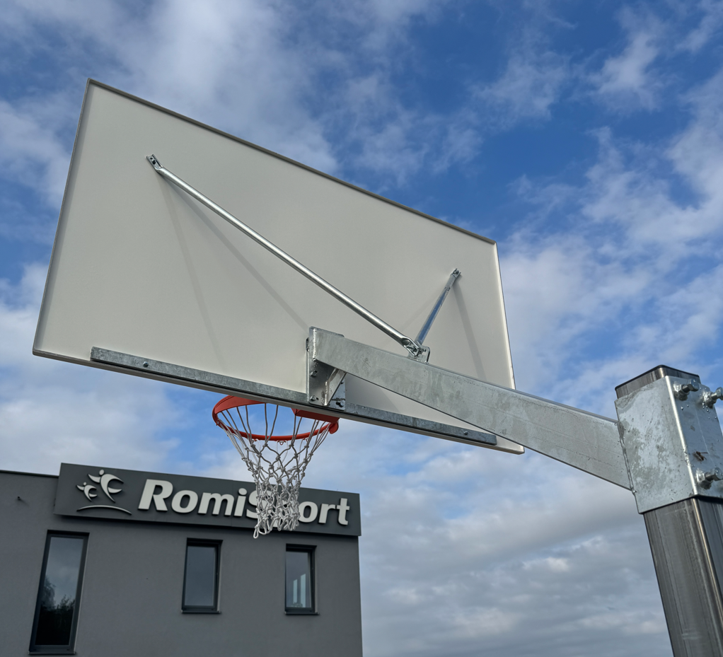 Konstrukcja oparta jest na stalowym słupie o profilu 100 × 100 mm, co zapewnia dużą sztywność i stabilność podczas gry. Wysięg 160 cm od osi słupa do obręczy daje bezpieczny dystans od konstrukcji nośnej, a maksymalna wysokość obręczy 305 cm odpowiada pełnowymiarowemu standardowi boiskowemu. Regulacja wysokości odbywa się poprzez przesuw wysięgnika wzdłuż słupa, co umożliwia dopasowanie ustawienia do różnych grup wiekowych.