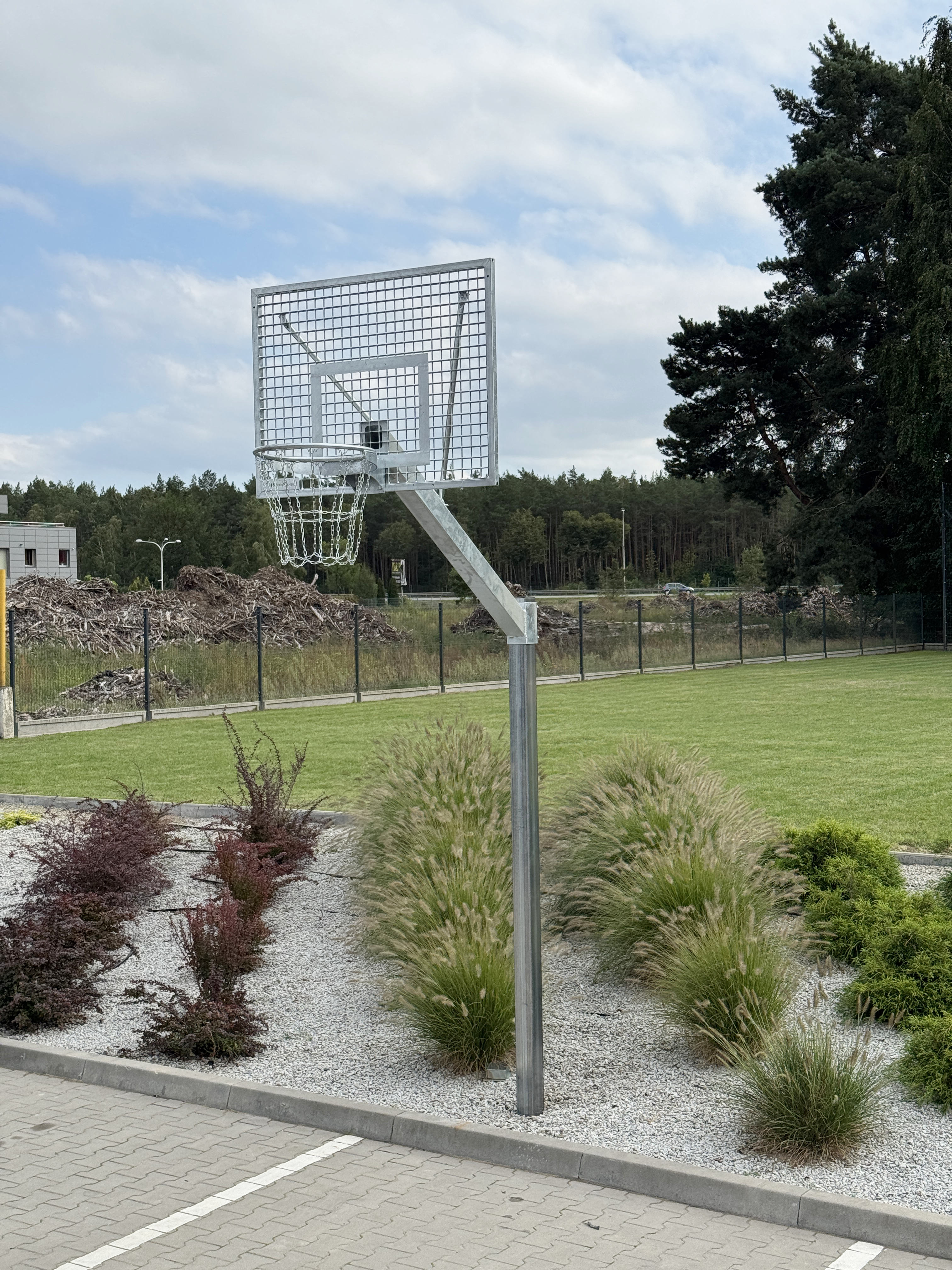 Konstrukcja kosza oparta jest na stalowej ramie nośnej, zapewniającej wysoką sztywność oraz stabilność podczas intensywnej eksploatacji. Zastosowanie tablicy w formie kratownicy zwiększa odporność całego zestawu na obciążenia oraz uszkodzenia mechaniczne, co ma szczególne znaczenie na obiektach zewnętrznych.