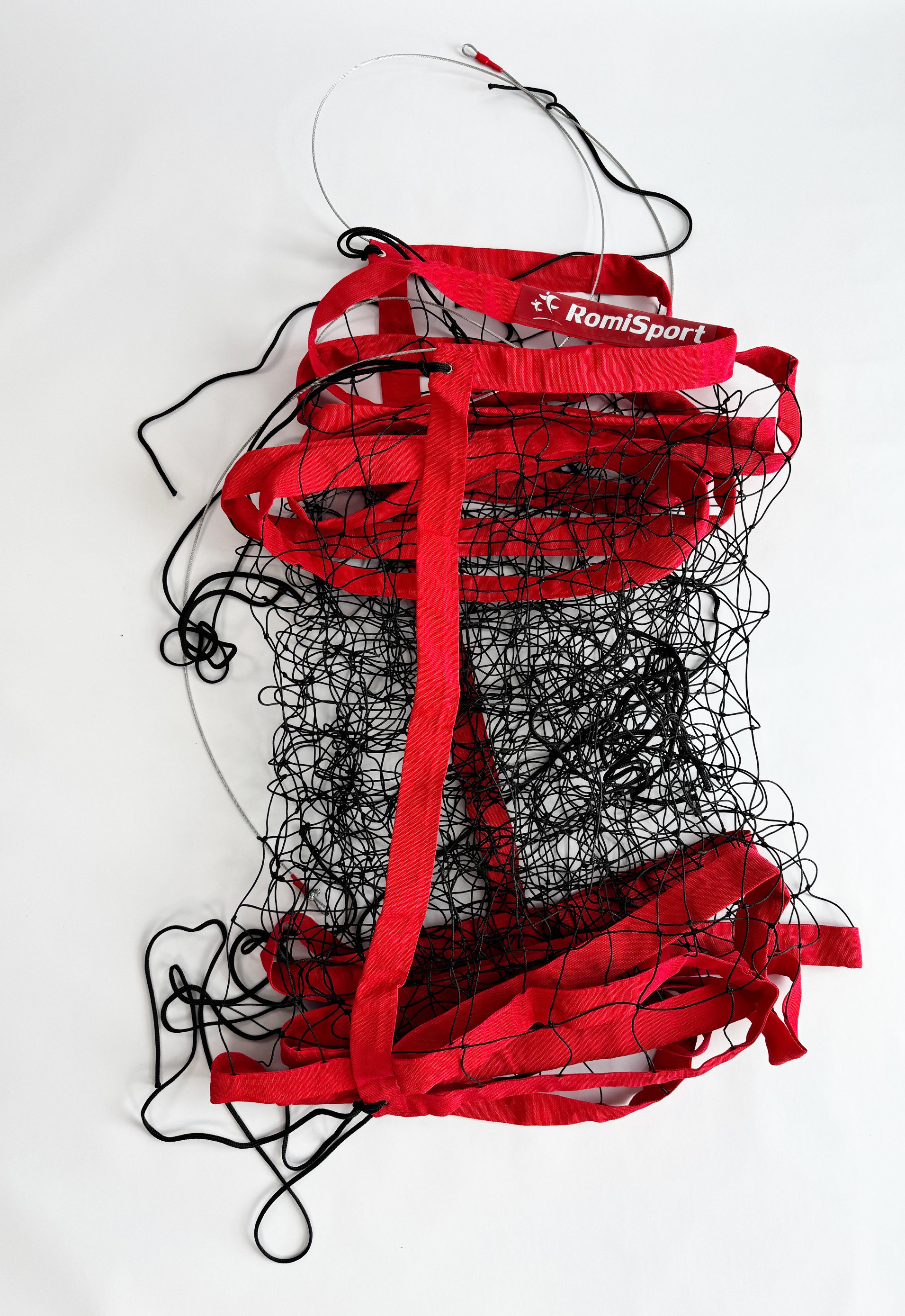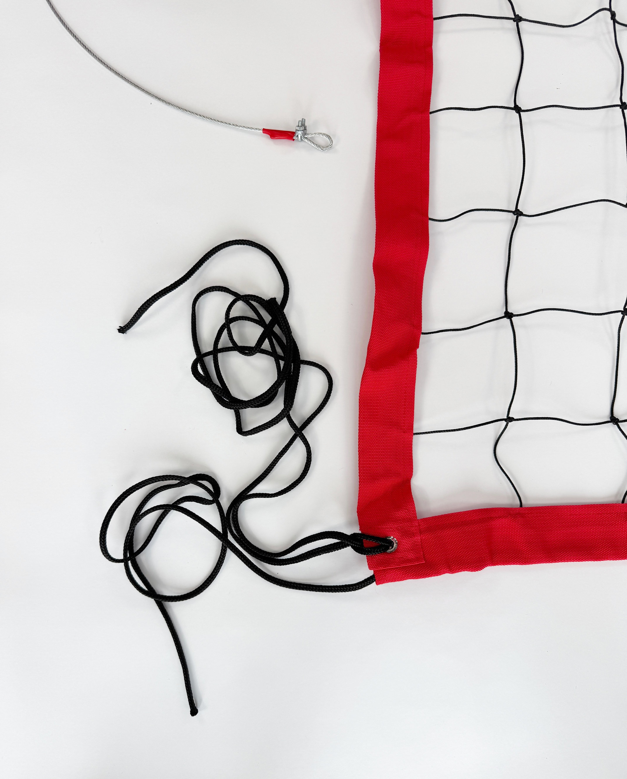 Cały obwód wykończono taśmą polipropylenową o szerokości 5 cm w kolorze czerwonym. Szerokie obszycie stabilizuje krawędzie i ogranicza ich falowanie podczas gry, a kontrast z czarnym polem siatki poprawia widoczność górnej taśmy. Górny naciąg stanowi stalowa linka o długości 11,7 m, co pozwala na bezpieczne osadzenie w większości standardowych słupków halowych. Dolny naciąg oparto na lince polipropylenowej oraz dwóch dodatkowych punktach napinających w każdym z rogów, co umożliwia równomierne dociągnięcie dolnej krawędzi.