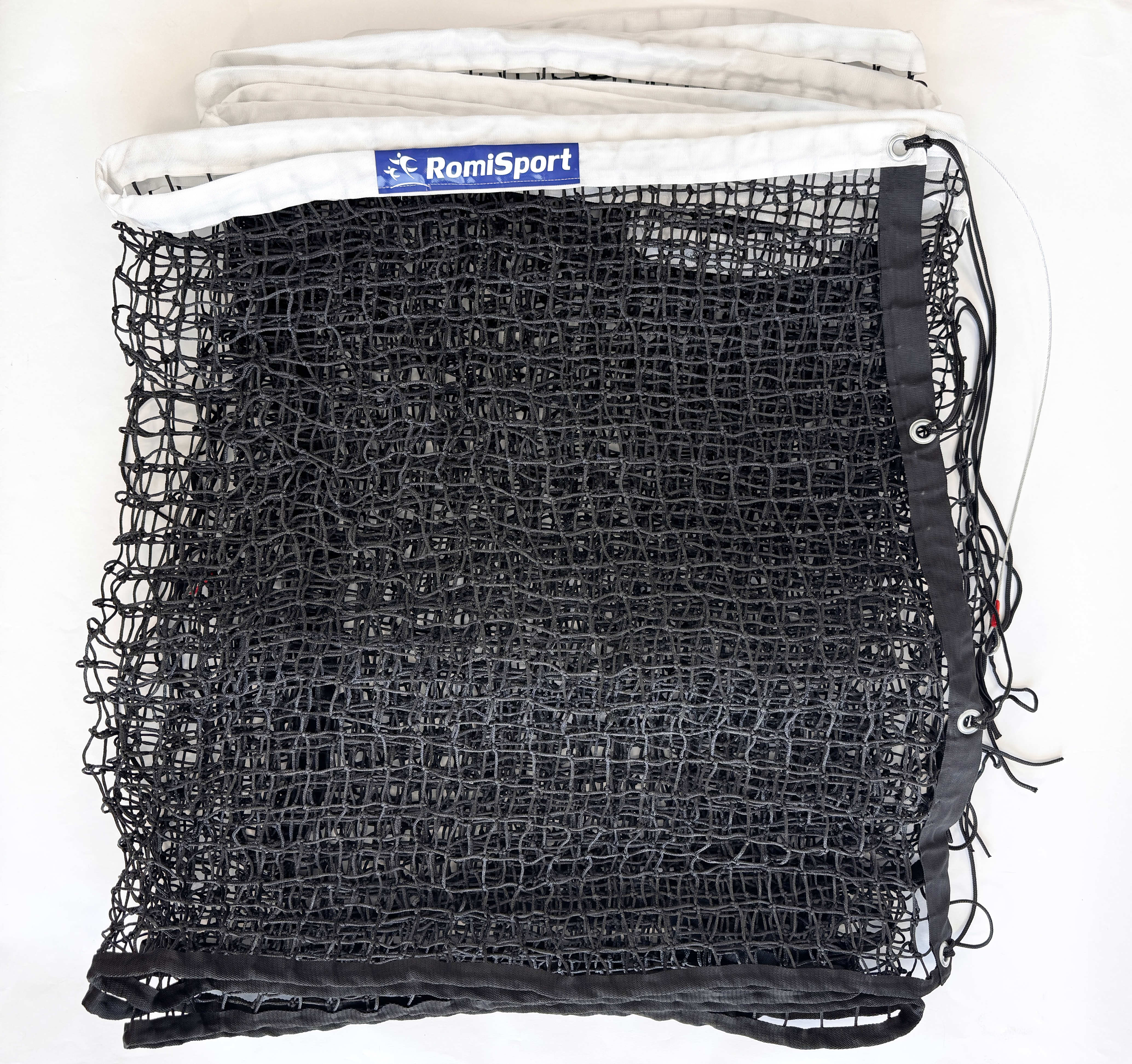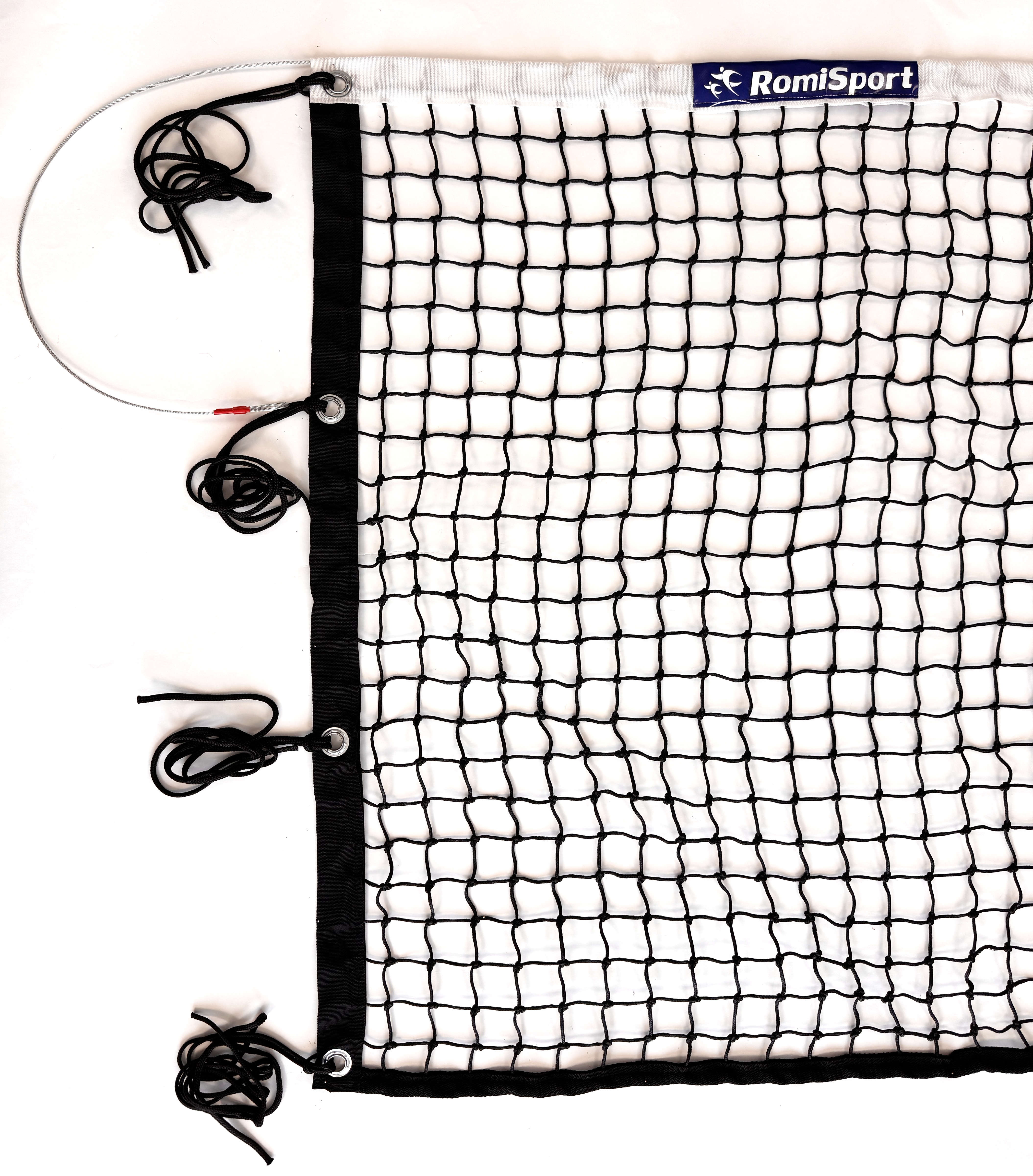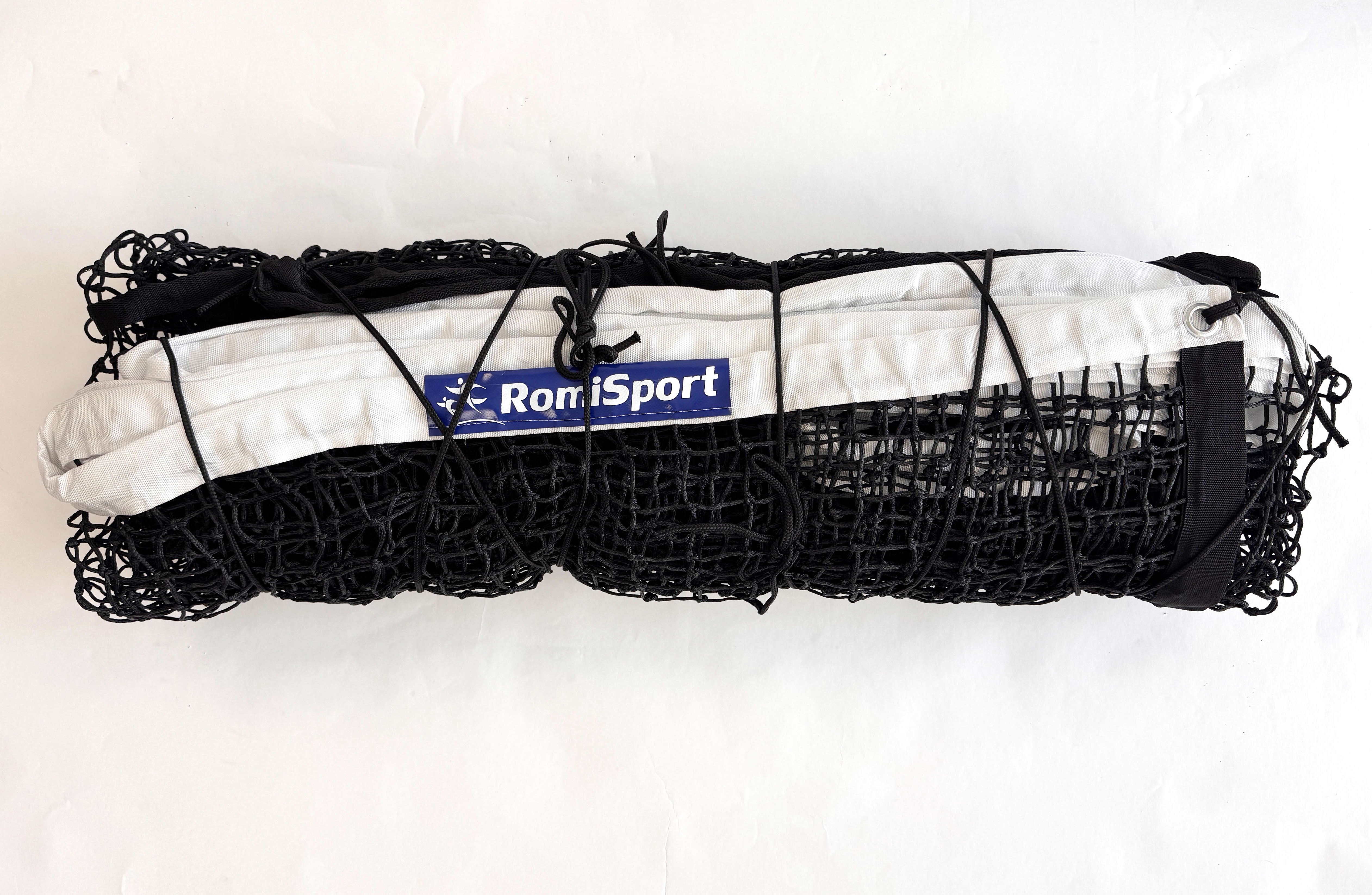 Górne obszycie wykonano z białej taśmy polipropylenowej, co poprawia widoczność siatki podczas gry i jednocześnie chroni krawędź przed przetarciami. Zestaw obejmuje siatkę wraz z linkami naciągowymi; nie zawiera elementów montażowych do słupków ani mechanizmu napinającego. Producent RomiSport udziela gwarancji na okres: 24 miesięcy.