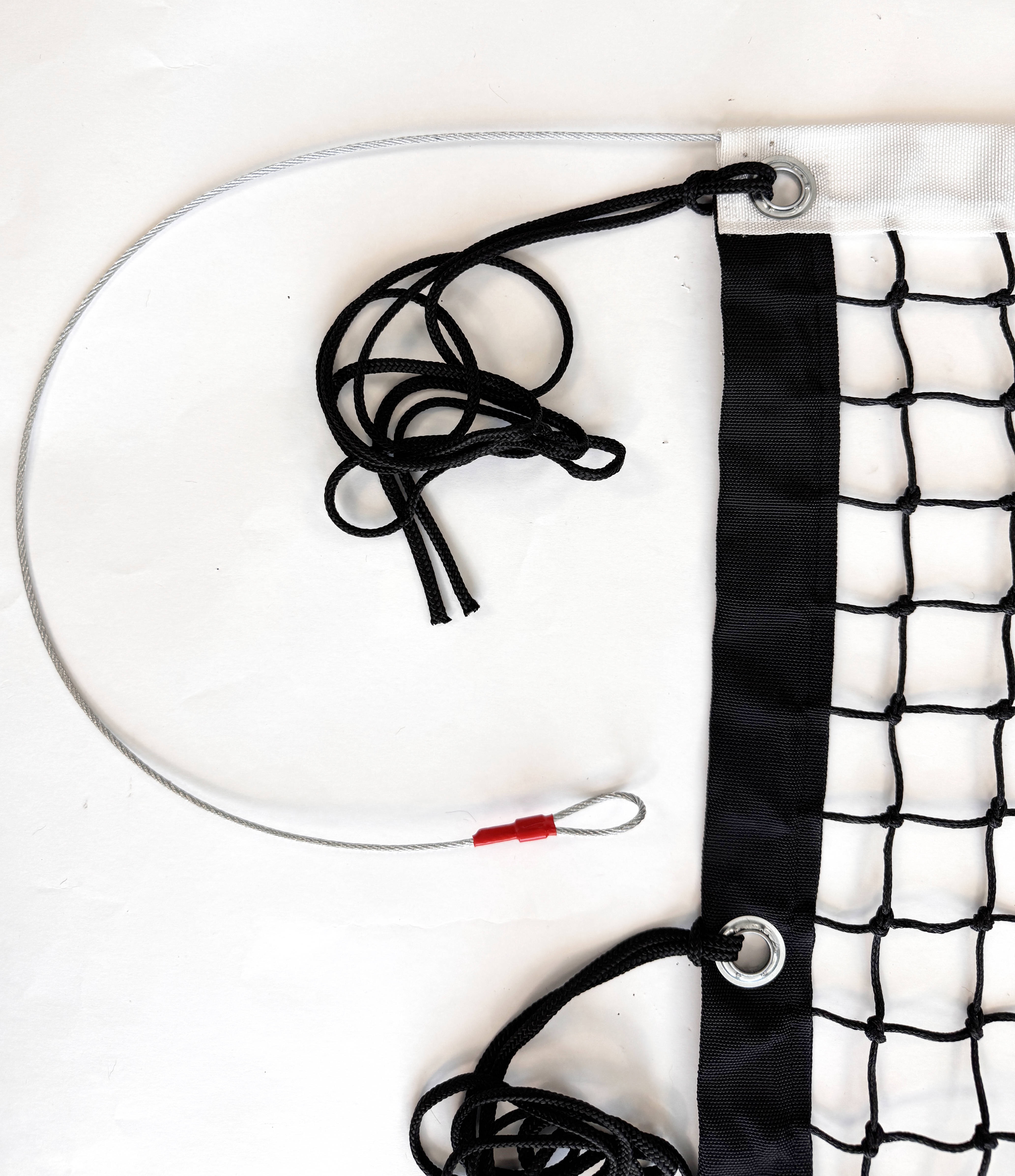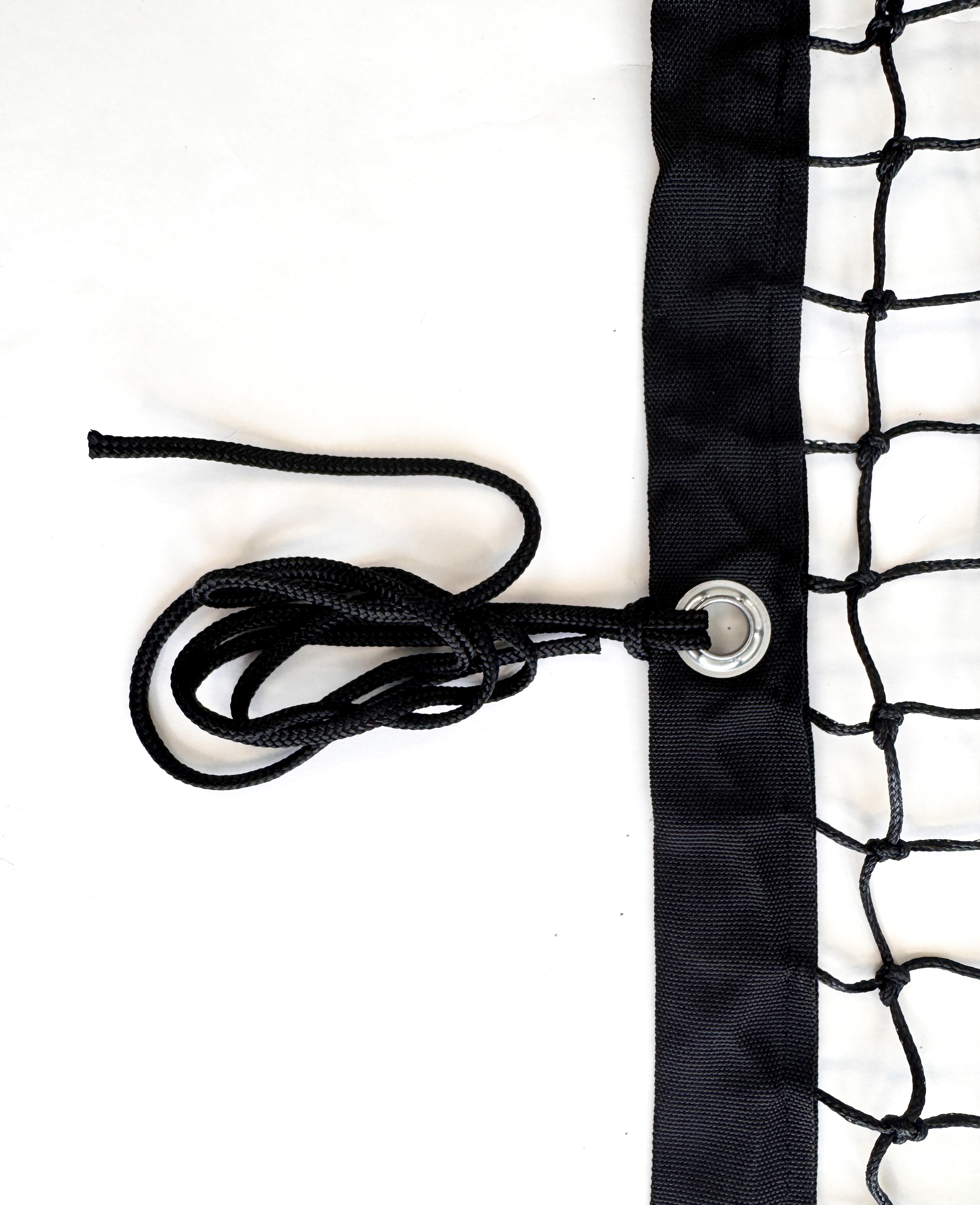 Górny naciąg realizowany jest przez linkę stalową o długości 14 m, co pozwala na prawidłowe przeprowadzenie jej przez słupki i system napinający. W praktyce stalowa linka ogranicza wydłużanie się pod obciążeniem i stabilizuje górną krawędź siatki. Dolny naciąg stanowi linka polipropylenowa, której zadaniem jest utrzymanie właściwego przylegania dolnej części do nawierzchni kortu i ograniczenie podwiewania.