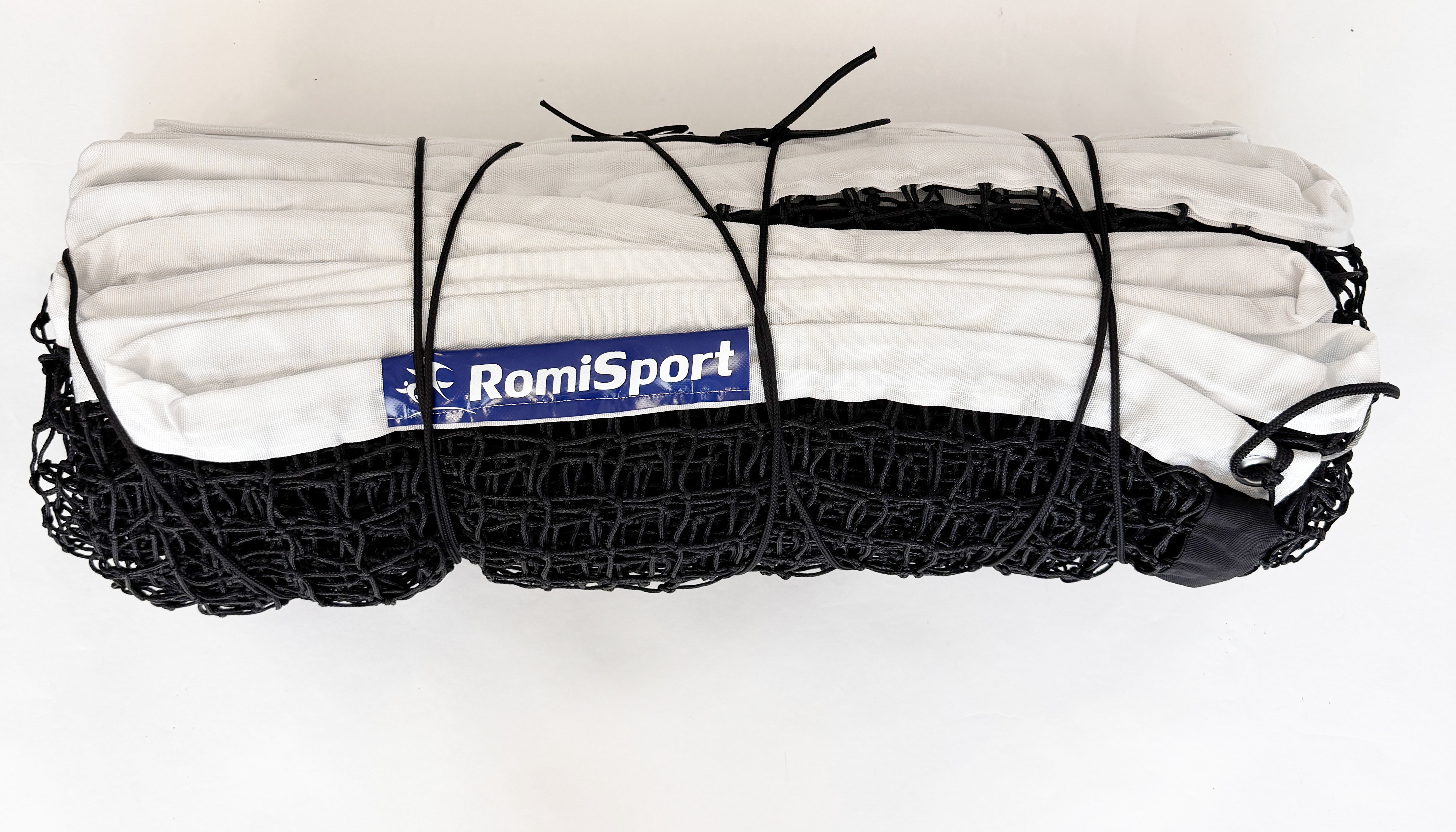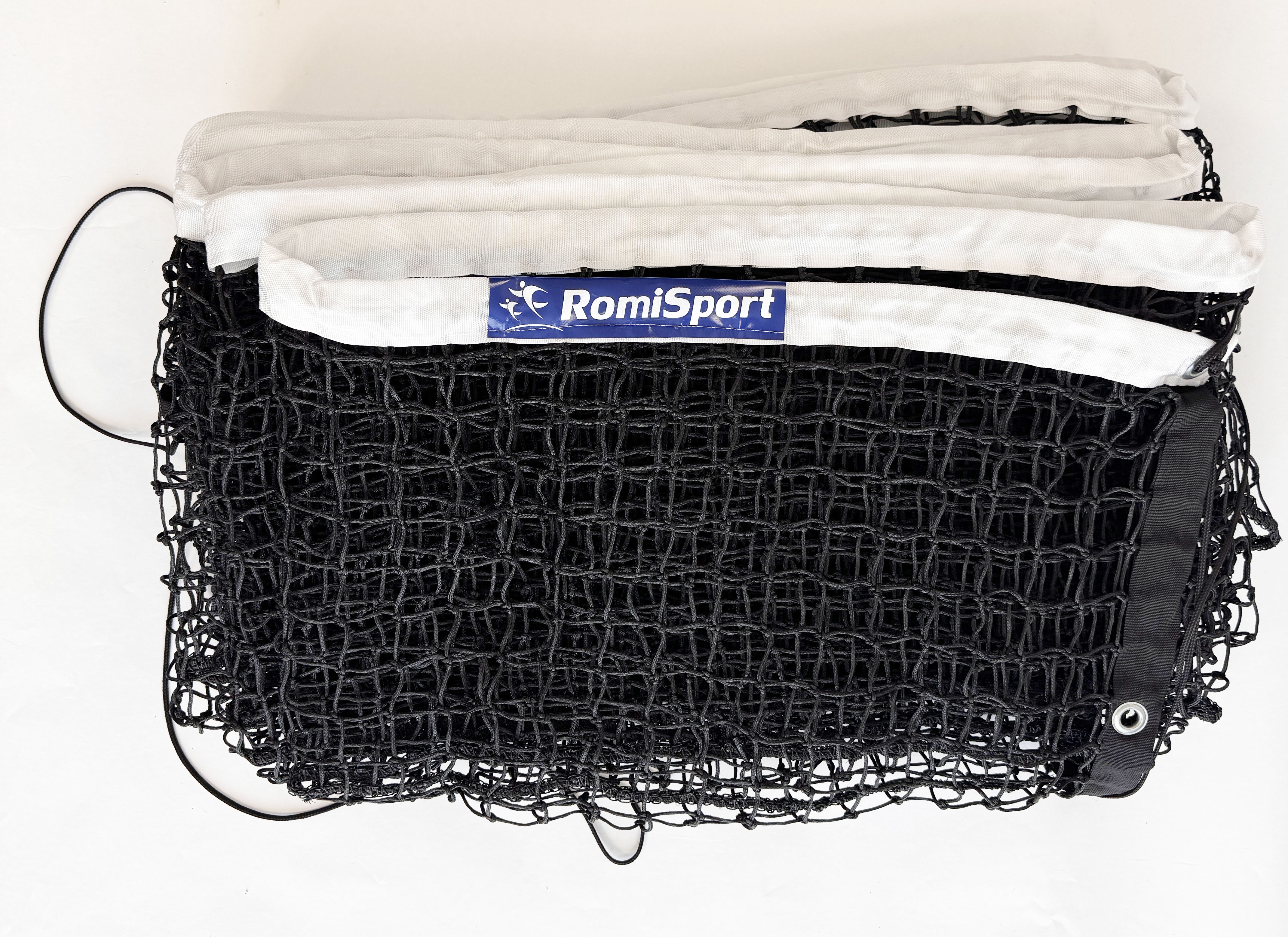 Górne obszycie wykonano z białej taśmy polipropylenowej, co poprawia widoczność siatki w trakcie wymian i chroni krawędź przed przetarciami. Zestaw obejmuje siatkę wraz z linką stalową i dolną; nie zawiera słupków ani mechanizmu napinającego. Producent RomiSport udziela gwarancji na okres: 24 miesięcy.