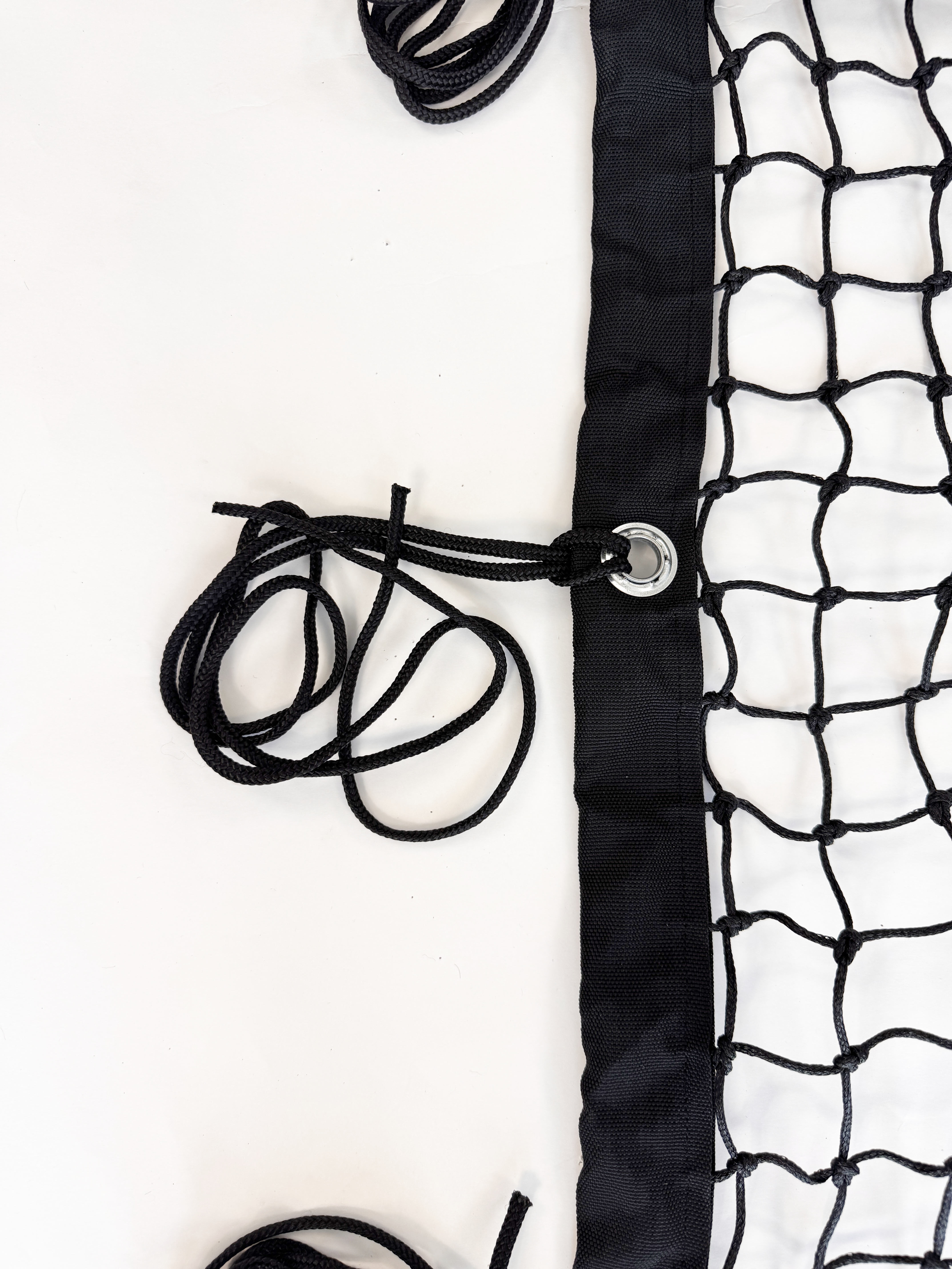Wypełnienie wykonano ze sznurka polietylenowego o średnicy 3 mm w układzie oczek 5 × 5 cm. Taka konfiguracja zapewnia równomierne przenoszenie obciążeń na całej szerokości siatki i utrzymanie kształtu przy regularnym napinaniu. Polietylen jako materiał syntetyczny dobrze znosi wilgoć i typowe warunki eksploatacji na zewnątrz (odporność UV – do weryfikacji), co przekłada się na stabilność parametrów w sezonie.