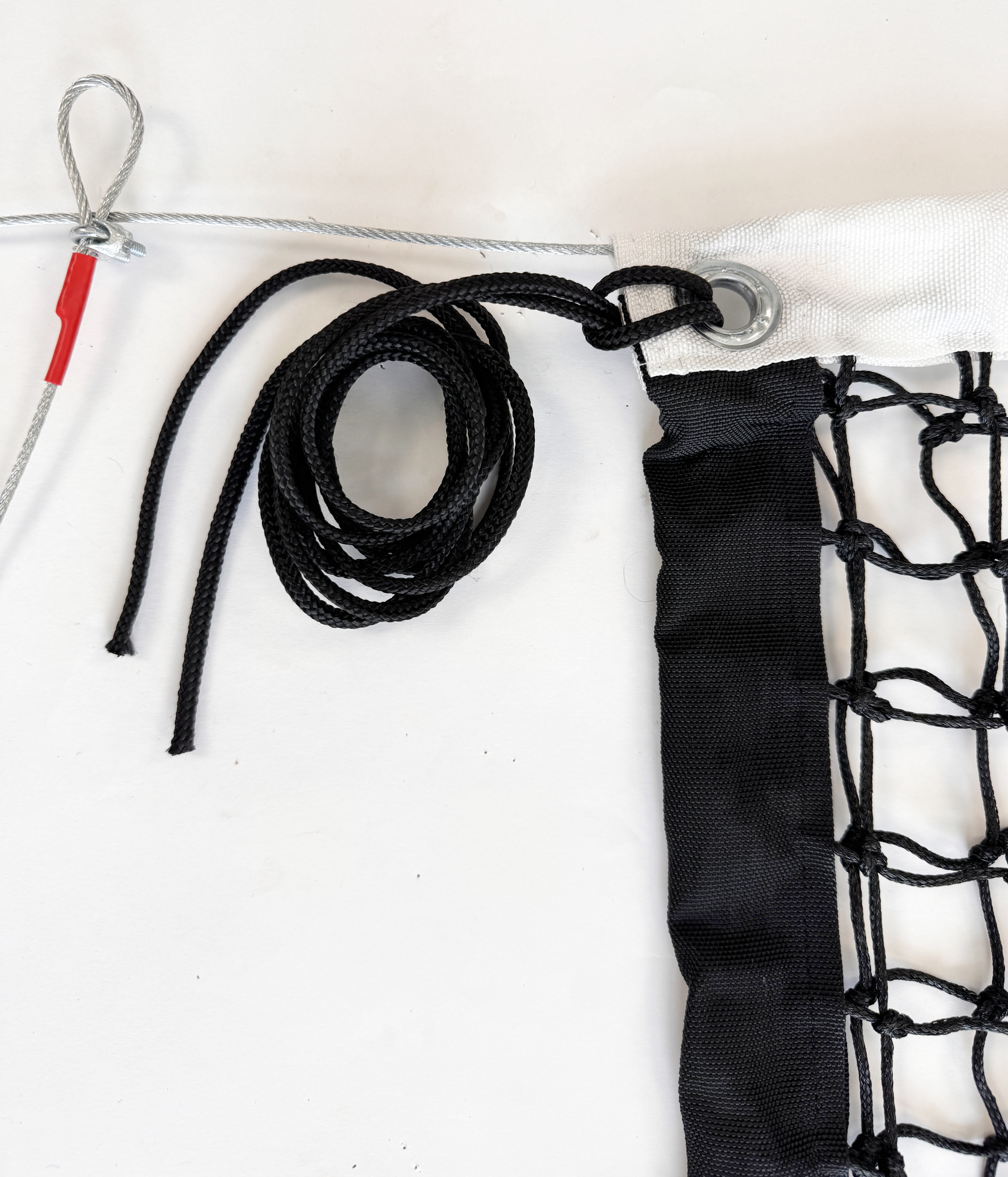 Górny naciąg realizowany jest przez linkę stalową, która odpowiada za utrzymanie stałej wysokości siatki na całej długości. Ograniczona podatność stali na rozciąganie stabilizuje górną krawędź podczas intensywnej gry. Dolny naciąg w postaci linki polipropylenowej wspiera równomierne przyleganie dolnej części do nawierzchni i współpracuje z fartuchem, redukując unoszenie się siatki pod wpływem wiatru.