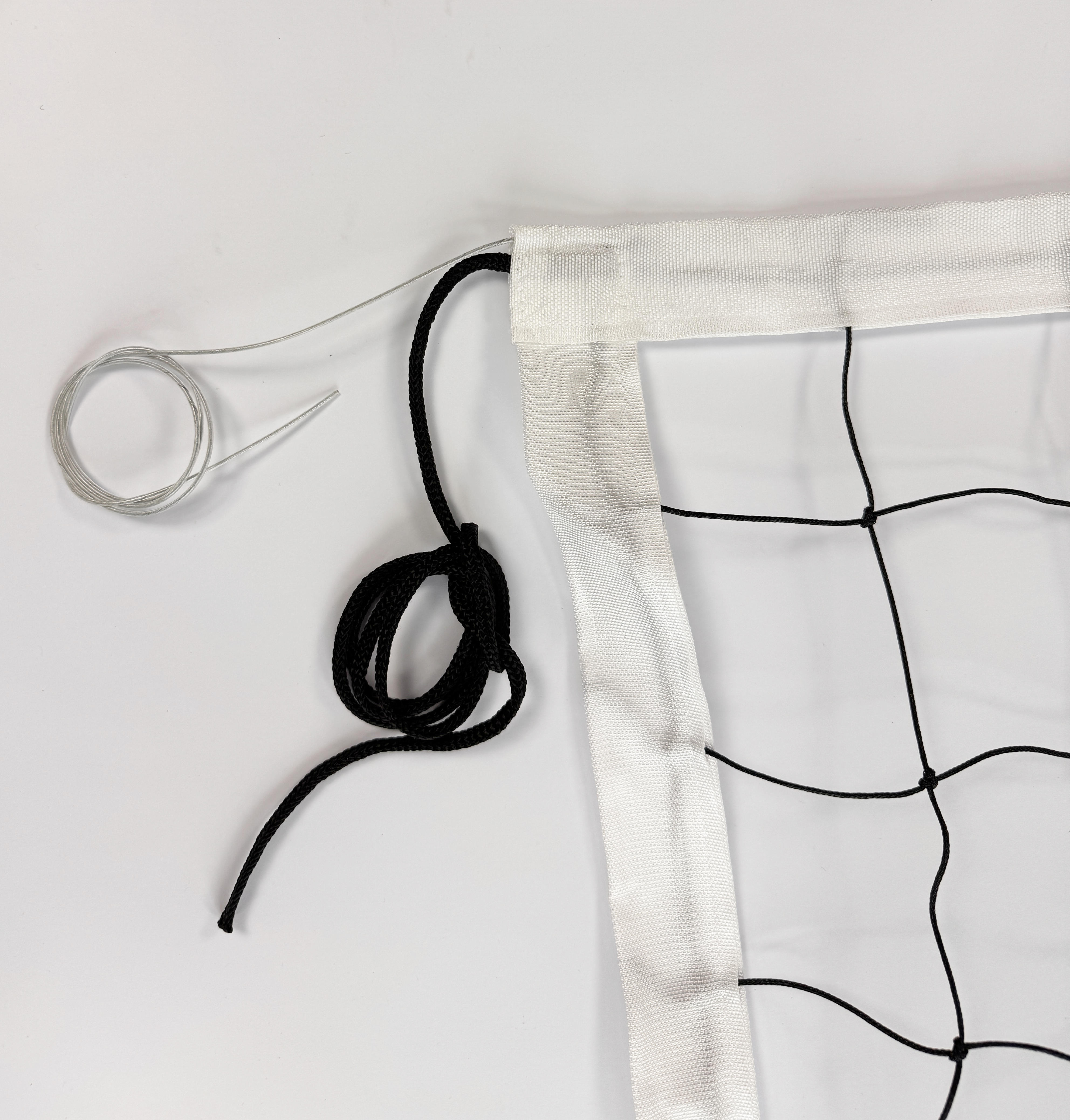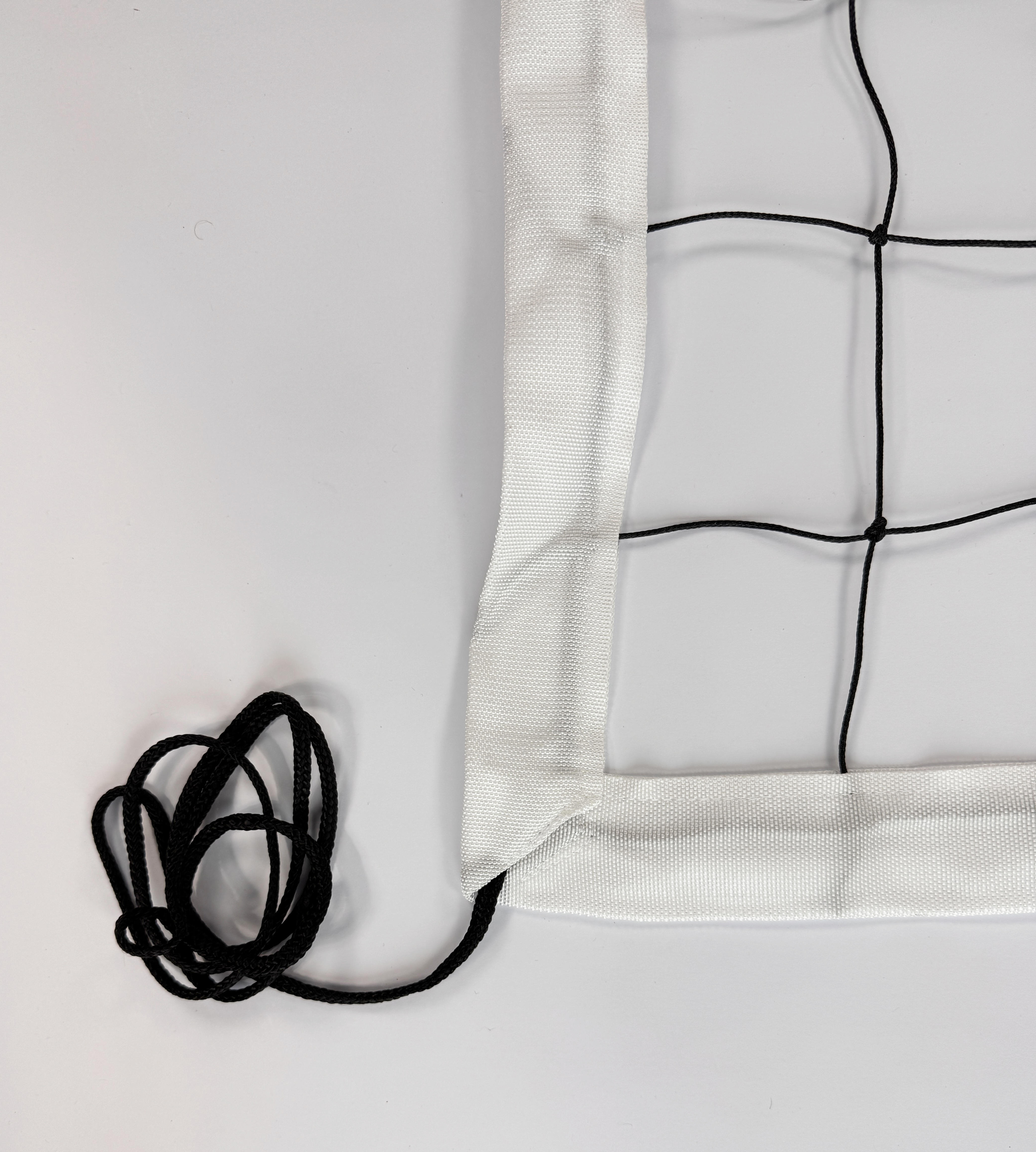 Obszycie po obwodzie wykonano z taśmy polipropylenowej w kolorze białym, co zwiększa wytrzymałość brzegów siatki i ułatwia wizualną orientację podczas gry. Górny naciąg realizowany jest za pomocą cienkiej linki stalowej o długości 11,7 m, a dolny przy użyciu sznurka polipropylenowego – taki układ pozwala utrzymać siatkę równomiernie napiętą i stabilną, mimo że przeznaczona jest głównie do rekreacji.