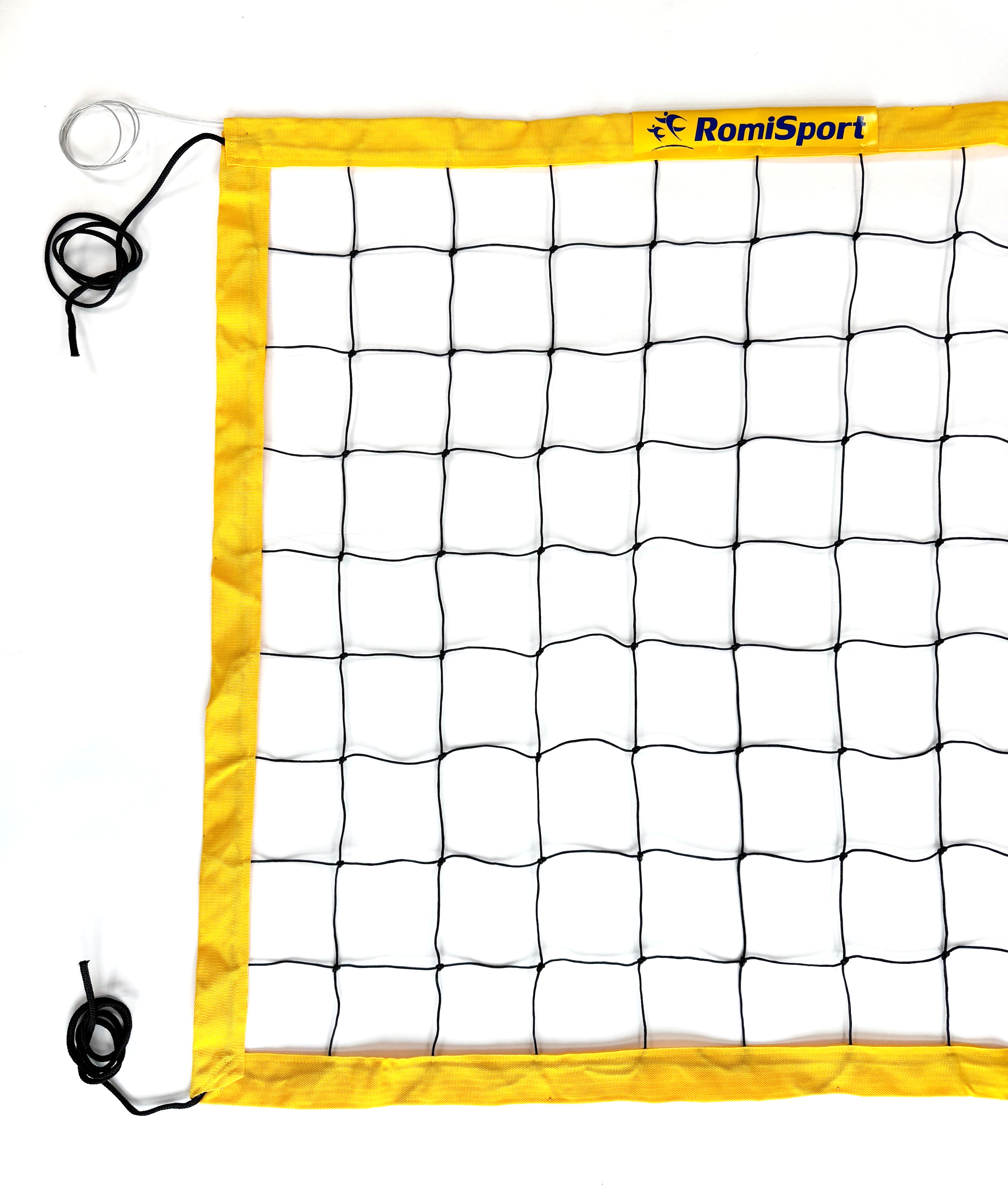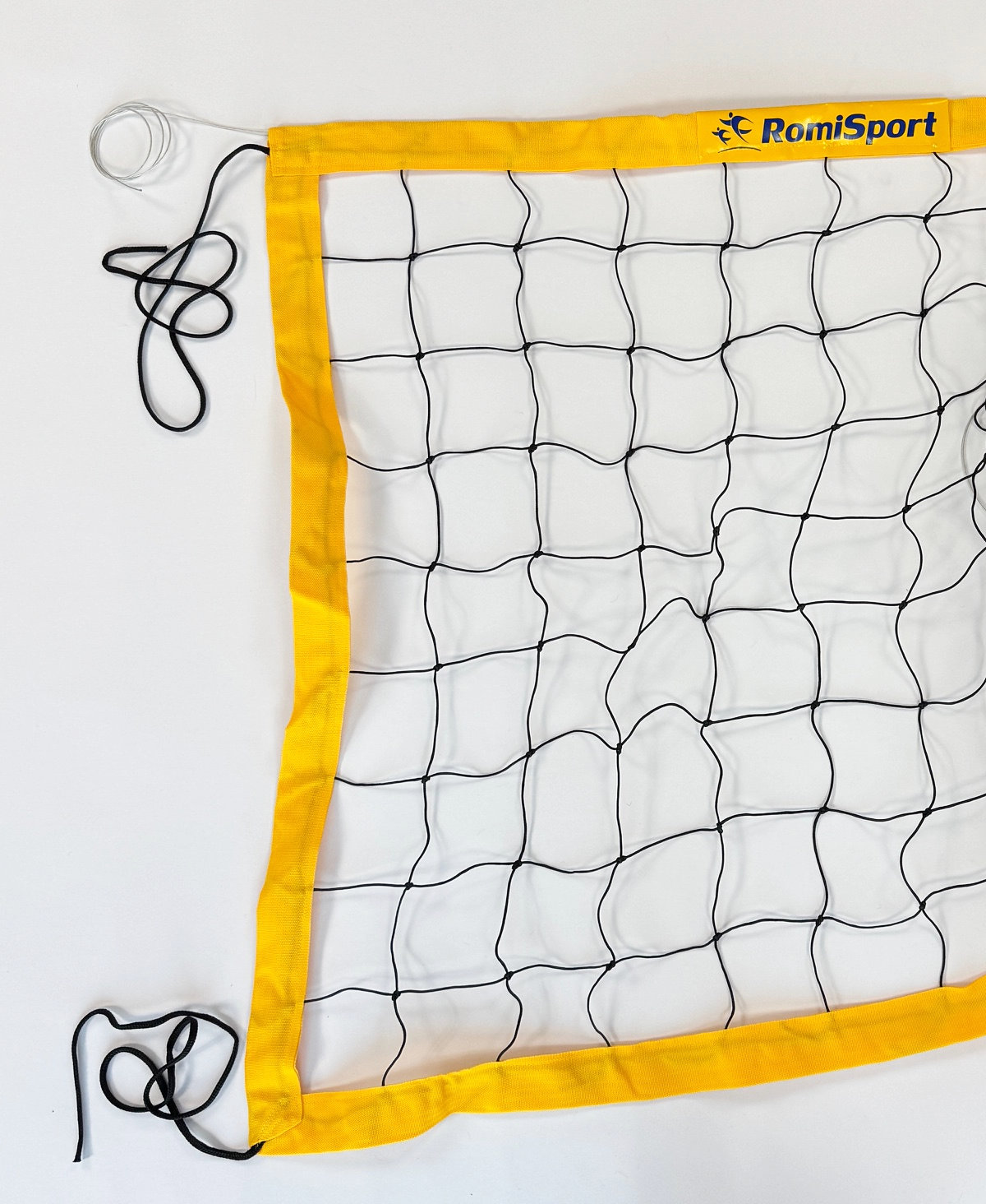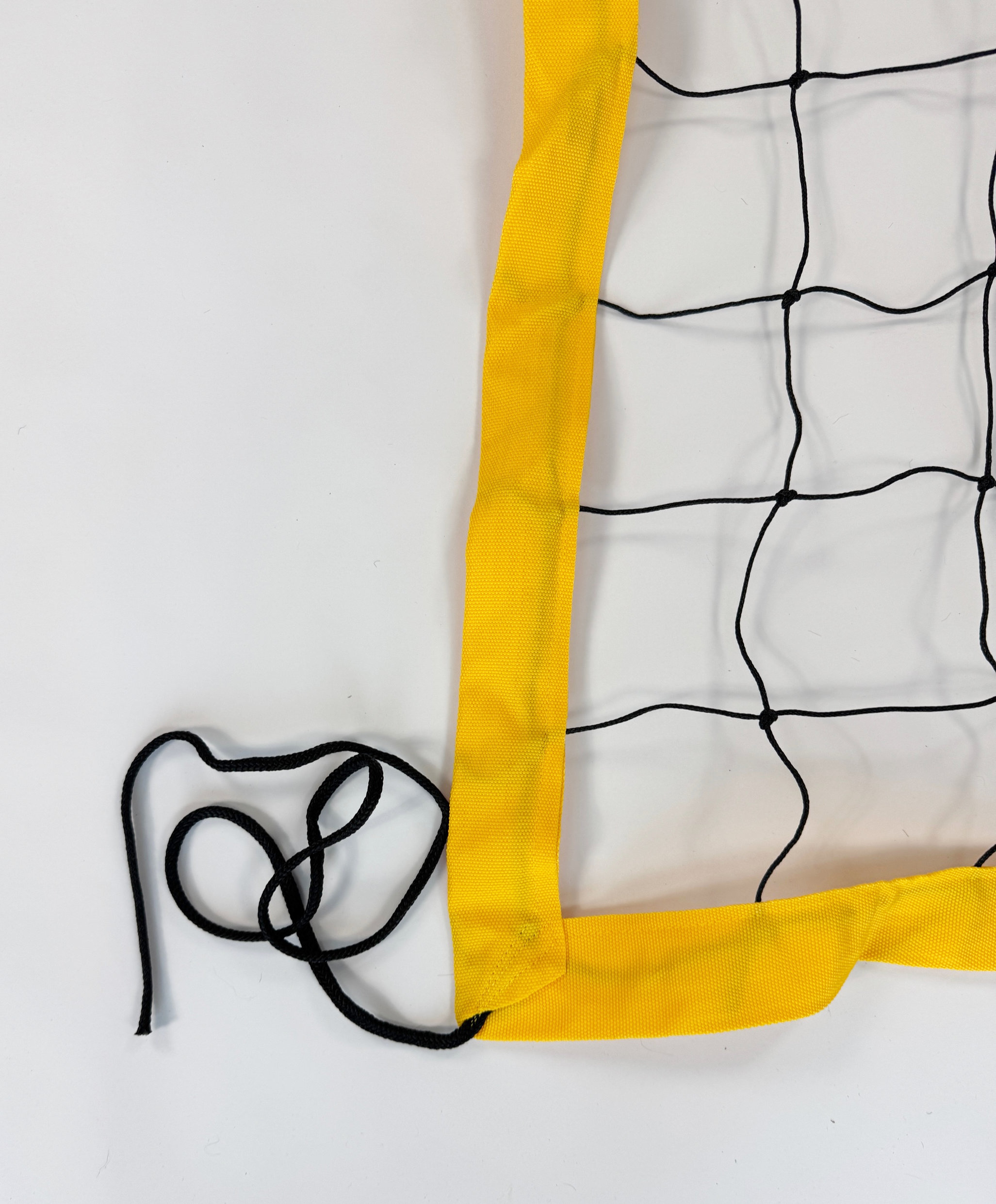 Obszycie po obwodzie wykonano z taśmy polipropylenowej w kolorze żółtym, co zwiększa wytrzymałość brzegów siatki i ułatwia wizualną orientację podczas gry. Górny naciąg realizowany jest za pomocą cienkiej linki stalowej o długości 11,7 m, a dolny przy użyciu sznurka polipropylenowego – taki układ pozwala utrzymać siatkę równomiernie napiętą i stabilną, mimo że przeznaczona jest głównie do rekreacji.