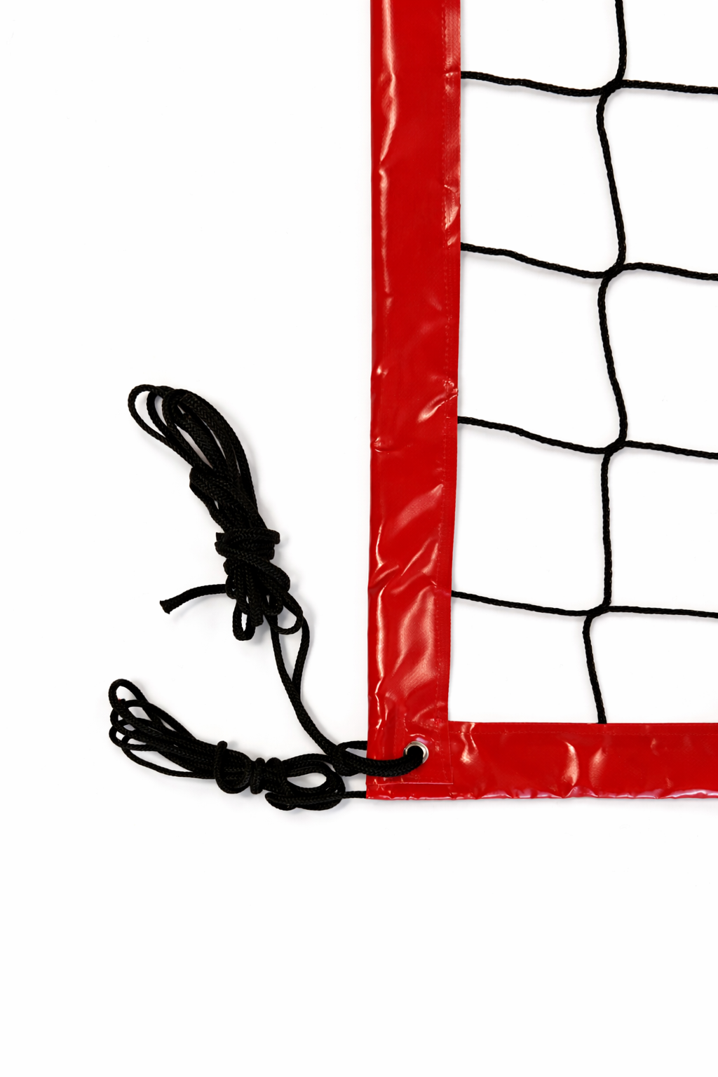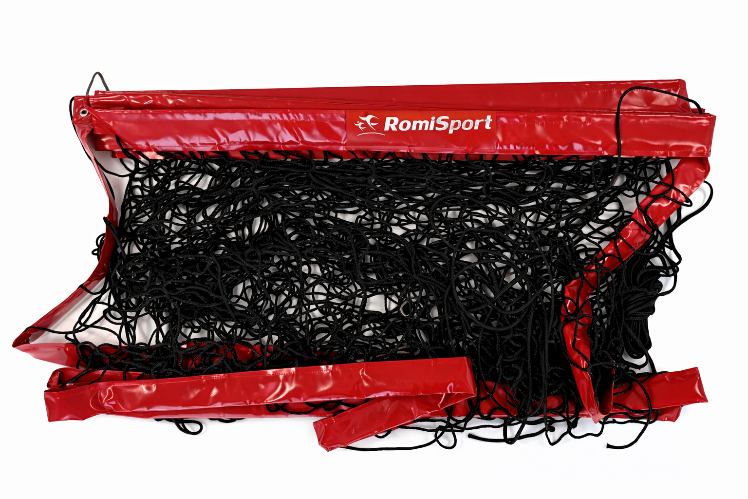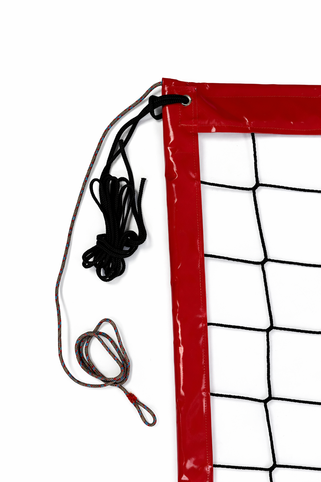 Profesjonalna siatka do siatkówki halowej z główną linką z kewlaru, obszycie w kolorze czerwonym, usztywnienie boczne. |