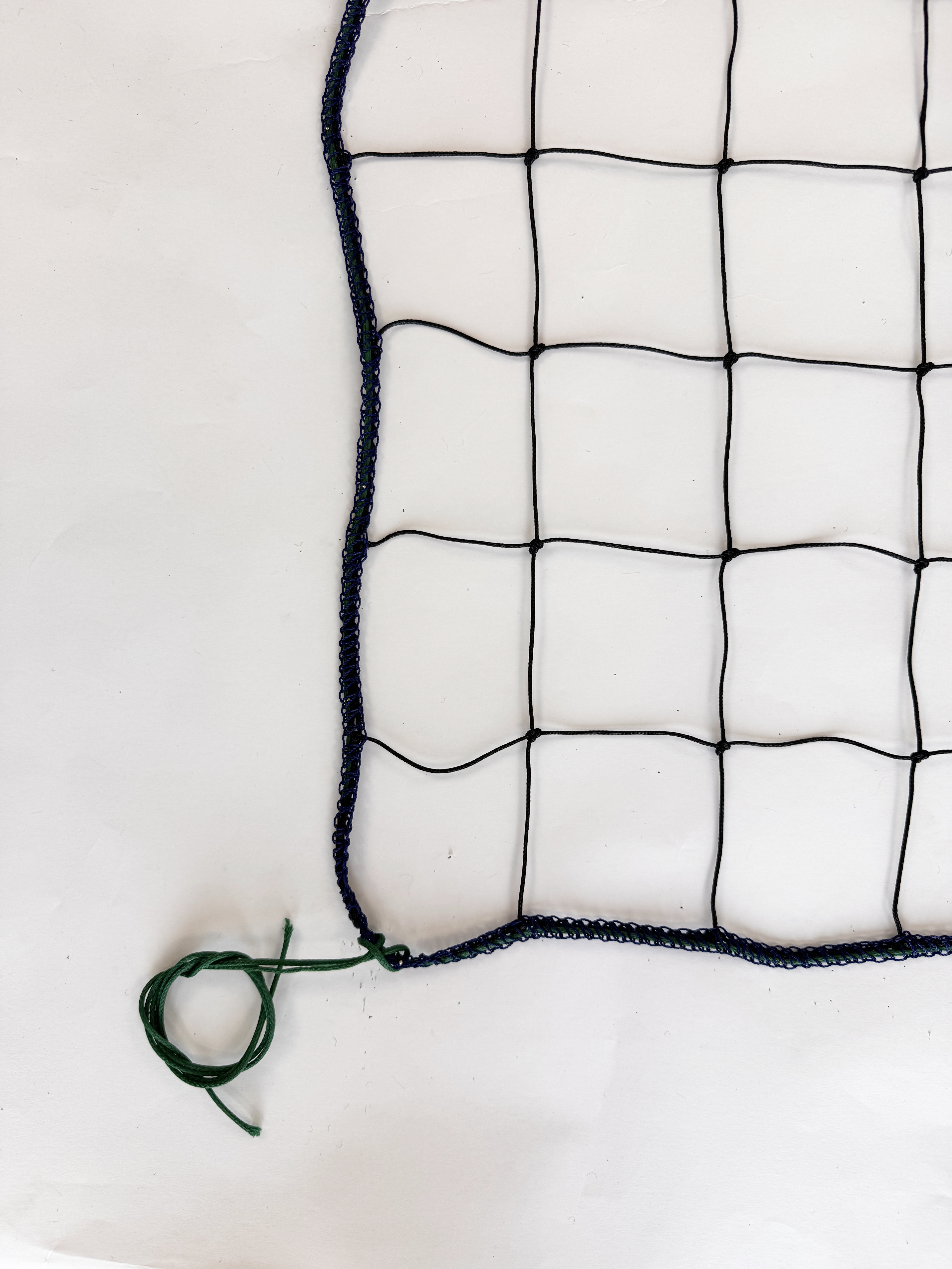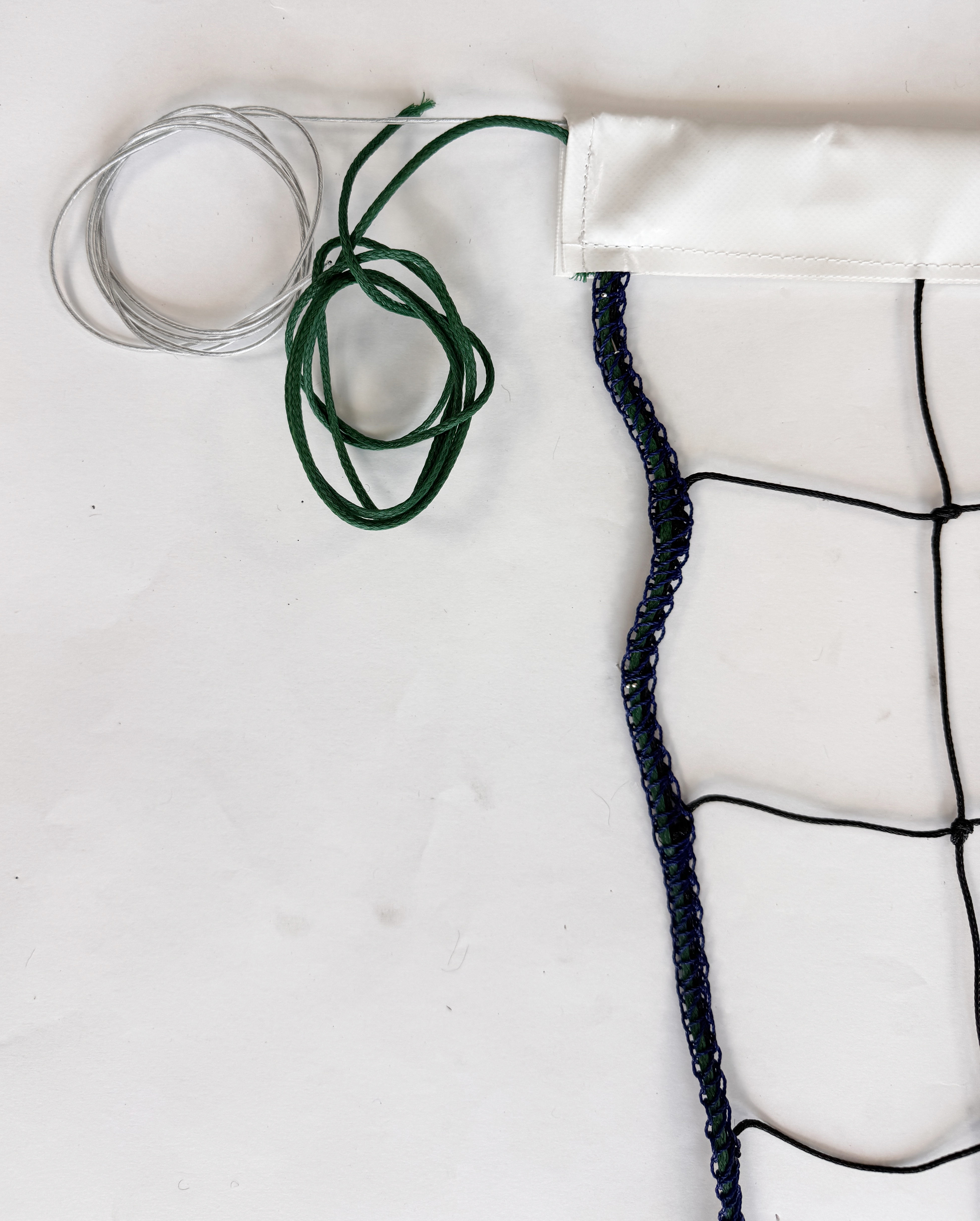 Górna krawędź obszyta jest taśmą polipropylenową w kolorze białym, co zwiększa wytrzymałość krawędzi i widoczność siatki, a jednocześnie ułatwia utrzymanie równomiernego napięcia. Górny naciąg realizowany jest przy użyciu cienkiej linki stalowej o długości 11,7 m, natomiast dolny naciąg wykonano ze sznurka polipropylenowego, co zapewnia stabilność całej konstrukcji i minimalizuje odkształcenia podczas gry.